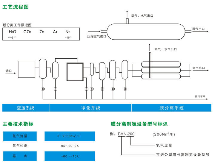膜分离技术是二十世纪中期发展起来的一种高新技术,近二、三十年来,在世界上得到了飞速的发展,膜分离技术正在为人类带来巨大的利益。薄膜对某些气体组具有选择性渗透和扩散的特性,因此可以达到分离气体的目的。中空纤维膜实际上是具有相同内外径的若干微孔管纤维膜,其结构与列管式换热器相似。纤维束相互独立,在膜组两端用环氧树脂进行密封。数十万根纤维捆在一起用来提供所需的表面积。在压力作用下,各种气体在中空纤维膜中的吸附、扩散、渗透速率不同,按顺序排列,我们称渗透速率大的气体为“快气”,如氧气、水气;渗透速率小的为“慢气”,如氮气。混合气体透过膜后, “快气”被富集在低压外侧,“慢气”被富集在高压内侧,从而实现了混合气体的分离。 通常一切气体均可以渗透通过高分子膜,其过程是气体分子首先被吸附并溶解于膜的高压侧表面,然后借助于浓度梯度在膜中扩散,最后从膜的低压侧解析出来,其结果是小分子和极性较强的分子(如水汽、氧气、二氧化碳等)的通过速度较快,在膜的渗透侧被富集;而大分子和极性较弱的分子(如氮气、氩气等)的通过速度较慢,被滞留在膜的滞留侧被富集从而达到混合气体分离的目的。膜分离就是利用各种气体在高分子膜上的渗透速率的不同,来进行气体分离的,其分离推动力为气体在膜两侧的分压差,所以膜法气体分离没有相变、不需要再生,它具有设备简单、操作及维护费用低等优点。一根膜分离器(组件)是由成千上万根中空纤维分离膜集装在一个外壳内,其结构类似于列管式换热器,它可以在最小的空间里提供最大的分离膜表面积,所以膜分离系统具有占地面积小、重量轻、分离效率高等优点。